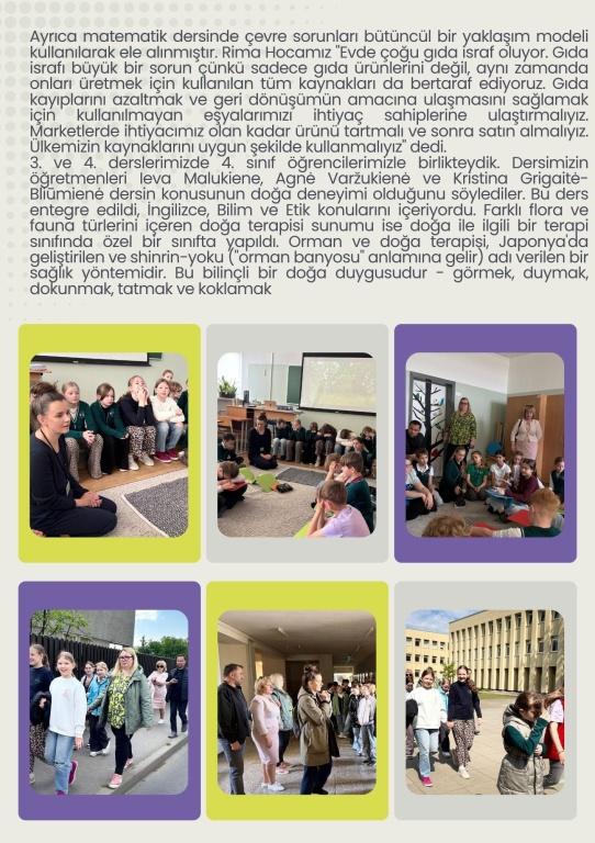 3. ve 4. derslerimizde 4. sınıf öğrencilerimizle birlikteydik. Dersimizin öğretmenleri Ieva Malukiene, Agnė Varžukienė ve Kristina Grigaitė-Bliūmienė dersin konusunun doğa deneyimi olduğunu söylediler. Bu ders entegre edildi, İngilizce, Bilim ve Etik konularını içeriyordu. Farklı flora ve fauna türlerini içeren doğa terapisi sunumu ise doğa ile ilgili bir terapi sınıfında özel bir sınıfta yapıldı. Orman ve doğa terapisi, Japonya'da geliştirilen ve shinrin-yoku ("orman banyosu" anlamına gelir) adı verilen bir sağlık yöntemidir. Bu bilinçli bir doğa duygusudur - görmek, duymak, dokunmak, tatmak ve koklamak