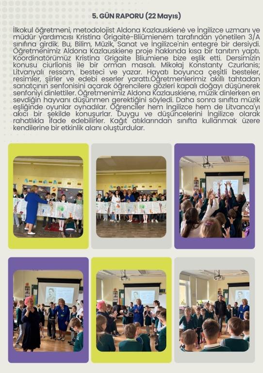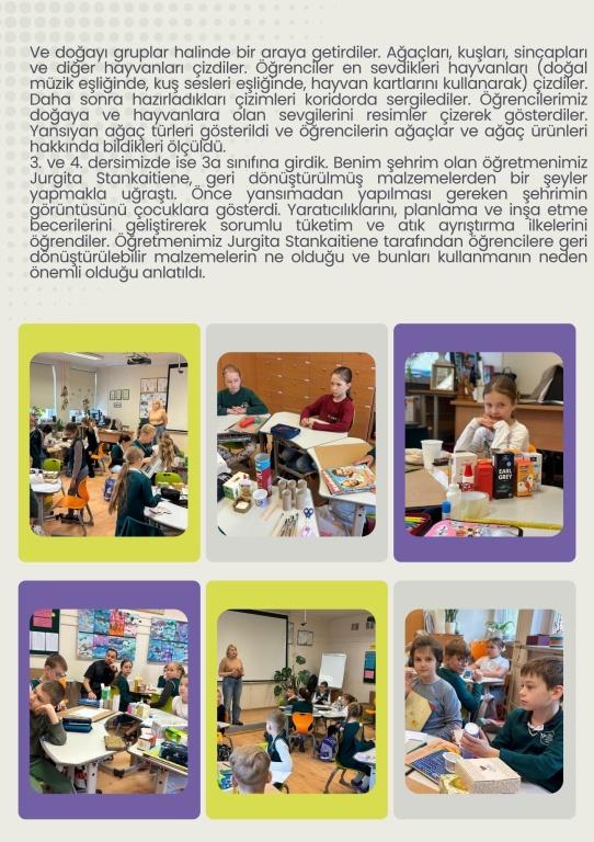 Öğretmenlerimiz akıllı tahtadan sanatçının senfonisini açarak öğrencilere gözleri kapalı doğayı düşünerek senfoniyi dinlettiler. Öğretmenimiz Aldona Kazlauskiene, müzik dinlerken en sevdiğin hayvanı düşünmen gerektiğini söyledi. Daha sonra sınıfta müzik eşliğinde oyunlar oynadılar. Öğrenciler hem İngilizce hem de Litvanca'yı akıcı bir şekilde konuşurlar. Duygu ve düşüncelerini İngilizce olarak rahatlıkla ifade edebilirler. Kağıt atıklarından sınıfta kullanmak üzere kendilerine bir etkinlik alanı oluşturdular. Ve doğayı gruplar halinde bir araya getirdiler. Ağaçları, kuşları, sincapları ve diğer hayvanları çizdiler. Öğrenciler en sevdikleri hayvanları (doğal müzik eşliğinde, kuş sesleri eşliğinde, hayvan kartlarını kullanarak) çizdiler. Daha sonra hazırladıkları çizimleri koridorda sergilediler. Öğrencilerimiz doğaya ve hayvanlara olan sevgilerini resimler çizerek gösterdiler. Yansıyan ağaç türleri gösterildi ve öğrencilerin ağaçlar ve ağaç ürünleri hakkında bildikleri ölçüldü.