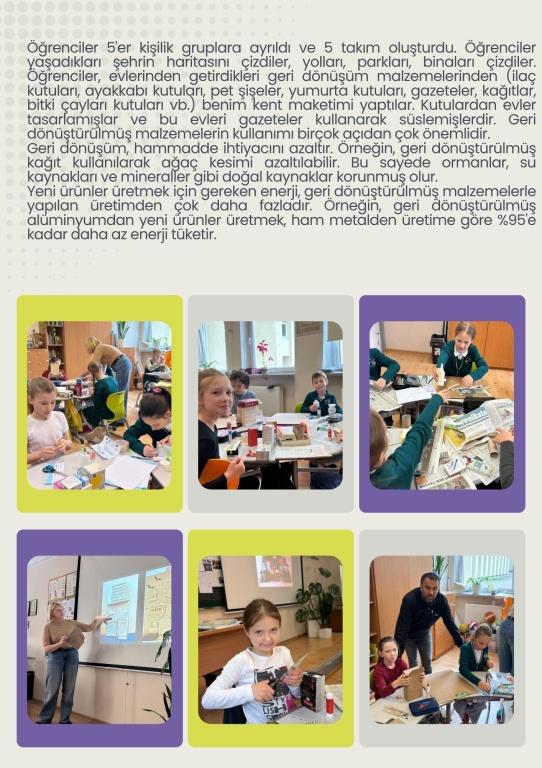 3. ve 4. dersimizde ise 3a sınıfına girdik. Benim şehrim olan öğretmenimiz Jurgita Stankaitiene, geri dönüştürülmüş malzemelerden bir şeyler yapmakla uğraştı. Önce yansımadan yapılması gereken şehrimin görüntüsünü çocuklara gösterdi. Yaratıcılıklarını, planlama ve inşa etme becerilerini geliştirerek sorumlu tüketim ve atık ayrıştırma ilkelerini öğrendiler. Öğretmenimiz Jurgita Stankaitiene tarafından öğrencilere geri dönüştürülebilir malzemelerin ne olduğu ve bunları kullanmanın neden önemli olduğu anlatıldı. Öğrenciler 5'er kişilik gruplara ayrıldı ve 5 takım oluşturdu. Öğrenciler yaşadıkları şehrin haritasını çizdiler, yolları, parkları, binaları çizdiler. Öğrenciler, evlerinden getirdikleri geri dönüşüm malzemelerinden (ilaç kutuları, ayakkabı kutuları, pet şişeler, yumurta kutuları, gazeteler, kağıtlar, bitki çayları kutuları vb.) benim kent maketimi yaptılar. Kutulardan evler tasarlamışlar ve bu evleri gazeteler kullanarak süslemişlerdir. Geri dönüştürülmüş malzemelerin kullanımı birçok açıdan çok önemlidir.