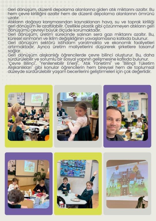 "Çevre Bilinci", "Yenilenebilir Enerji", "Atık Yönetimi" ve "Bilinçli Tüketim Alışkanlıkları" gibi konular öğrencilerin hem bireysel hem de toplumsal düzeyde sürdürülebilir yaşam becerilerini geliştirmeleri için çok değerlidir. Tokat İl MEM Konsorsiyumu öncülüğünde yürütülen Okul Eğitimi Akreditasyon Projesi kapsamında, 19-23 Mayıs 2025 tarihleri arasında Litvanya Kaunas Teknoloji Üniversitesi Vaižgantas Progymnasium okuluna gerçekleştirdiğimiz işbaşı gözlem faaliyeti sonucunda öğrencilerin Yeşilırmak İlkokulu yöneticileri olarak aşağıda sıraladığımız kazanımları elde ettiklerini gözlemledik.